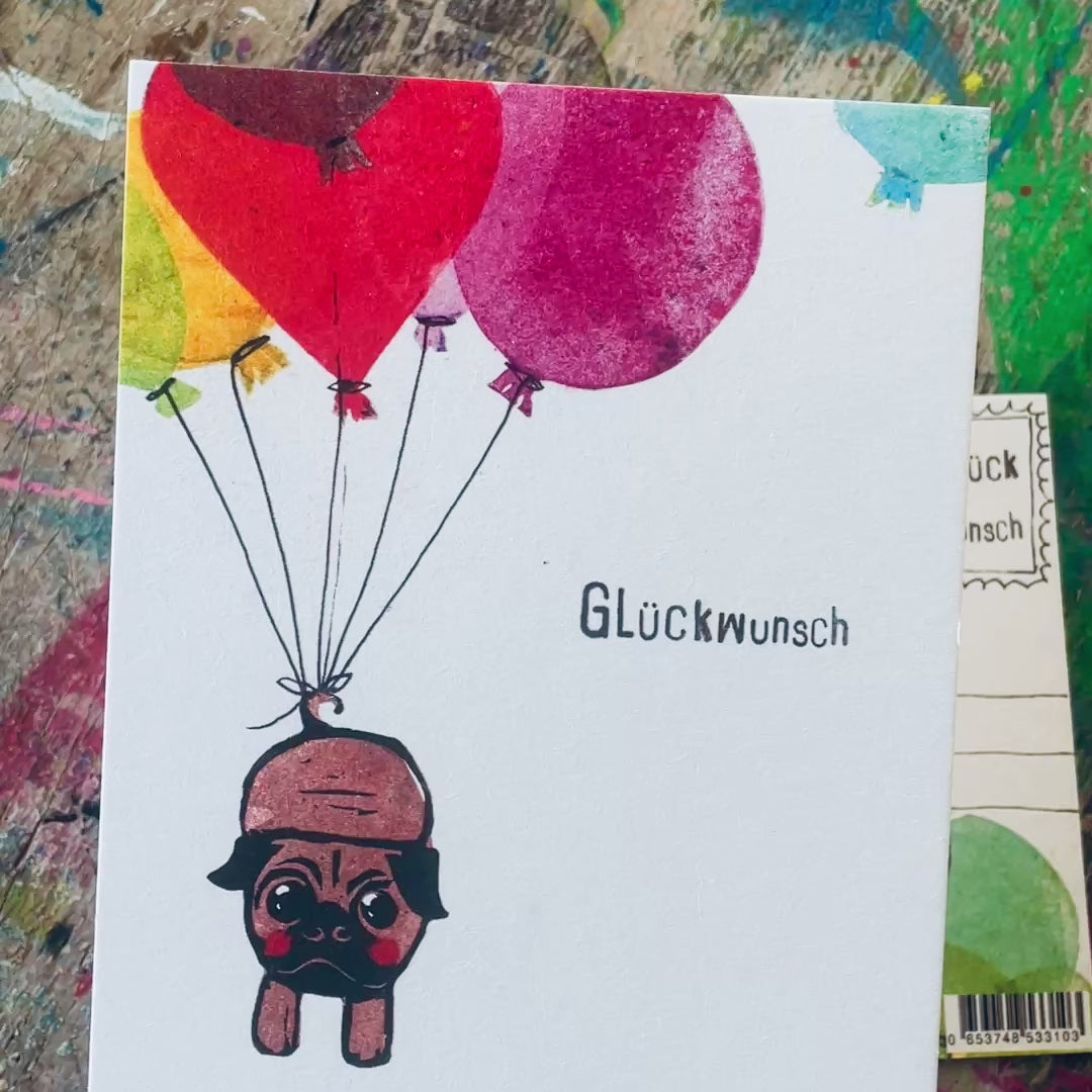 So liebenswert, wie Möpse eben sind: Kaum jemand überbringt Glückwünsche auf so charmante und tollpatschige Weise! Der Ausdruck, mit dem der Mops da so an seinen Ballons davonschwebt, zaubert mit Sicherheit ein Lächeln auf das Gesicht der Beglückwünschten.