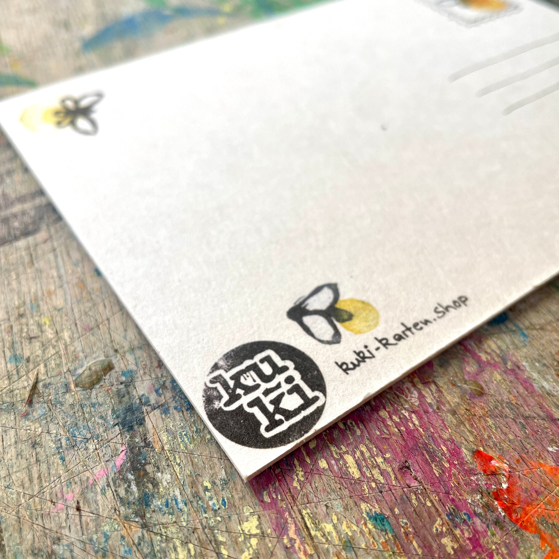 Und wie immer bei kuki: Das ursprüngliche Motiv entsteht von Hand aus selbstgeschnittenen Stempeln. Die Karten selbst werden anschließend hochwertig reproduziert, damit der kleine Zauber viele Menschen erreichen kann.