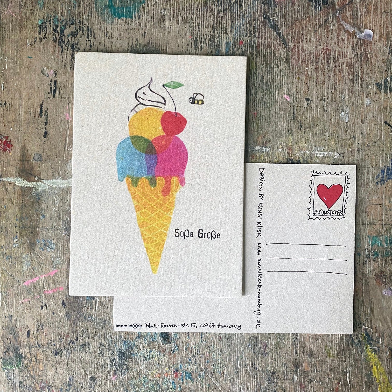Unsere Eis Postkarte ist ursprünglich aus selbstgeschnitzten Stempeln von Hand mit Liebe entstanden.