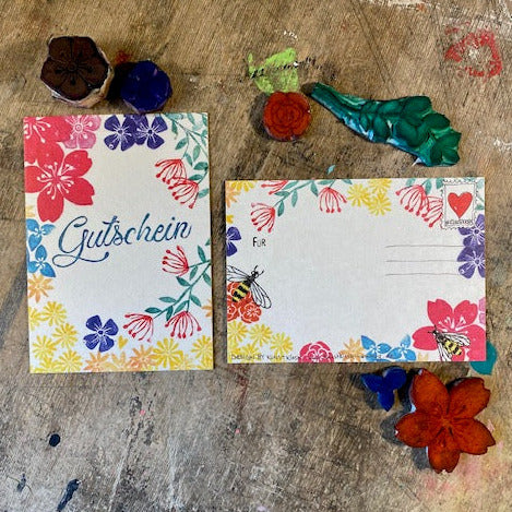 Blumen, Glückwünsche, gute Laune...unser power flower Gutschein bringt all das.Von hinten wie von vorne, geschmückt mit buntem Blumensommerkleidchen.Was ihr hineinsteckt, entscheidet ihr. Ein Ausflug in den Kletterpark, ein Picknick auf der Köhlbrandbrücke – was auch immer ihr verschenken möchtet. Diese Kärtchen kleiden das Geschenkte. Das Motiv ist ursprünglich aus selbstgeschnitzten Stempeln von Hand und mit Liebe entstanden.Die Karten sind klimaneutral in Deutschland gedruckt.