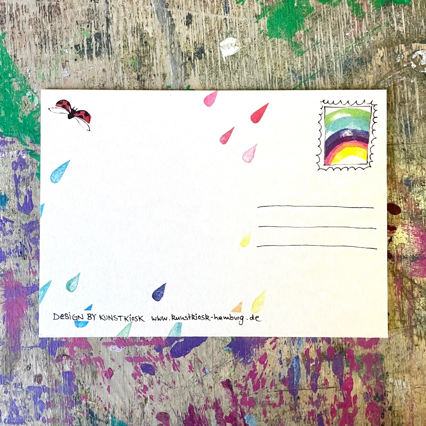 Auf der Rückseite sorgt ein Regenbogen-Briefmarken-Design mit extra viel Farbe für gute Laune. Diese Postkarte ist ein kleiner Lichtblick für die dunklen Tage.