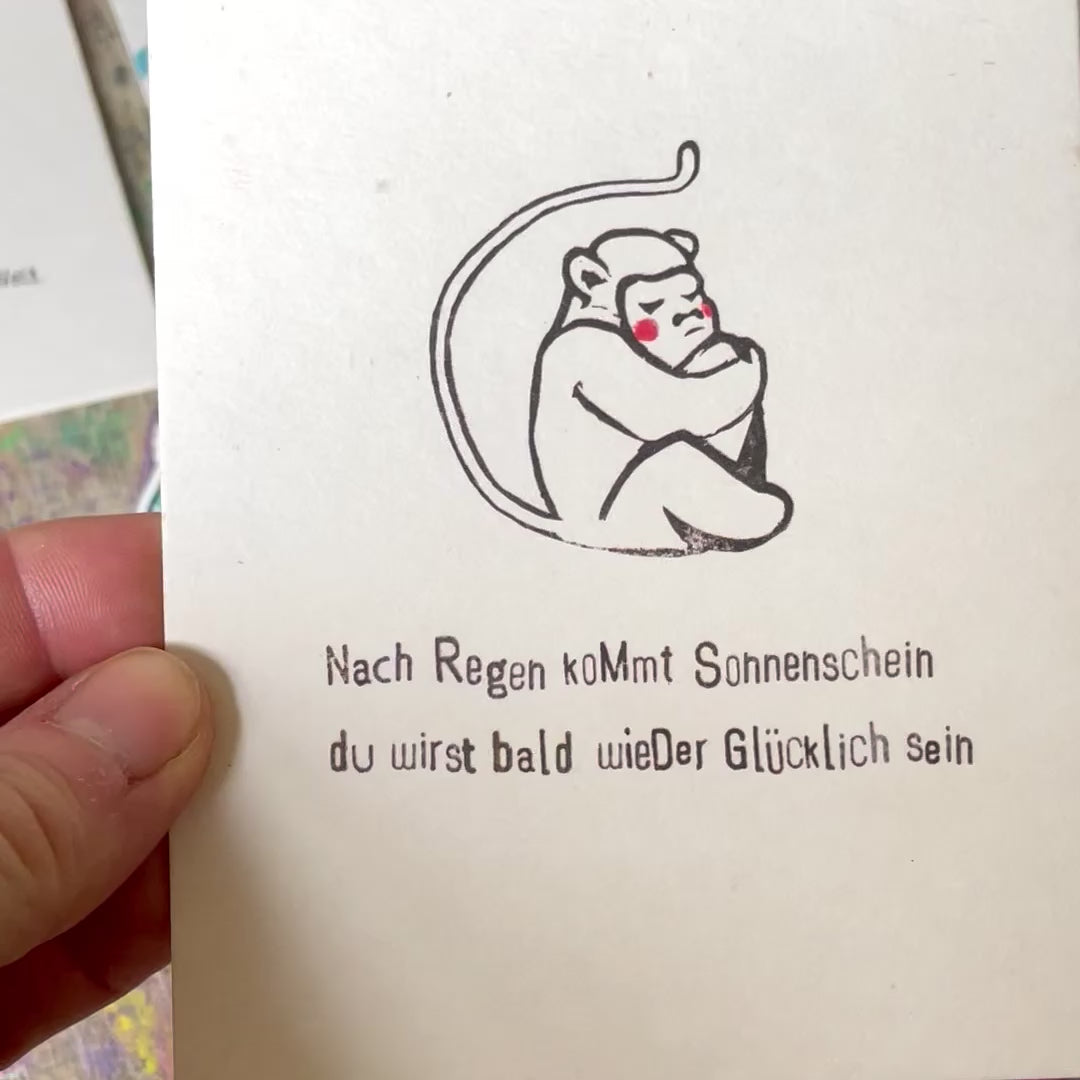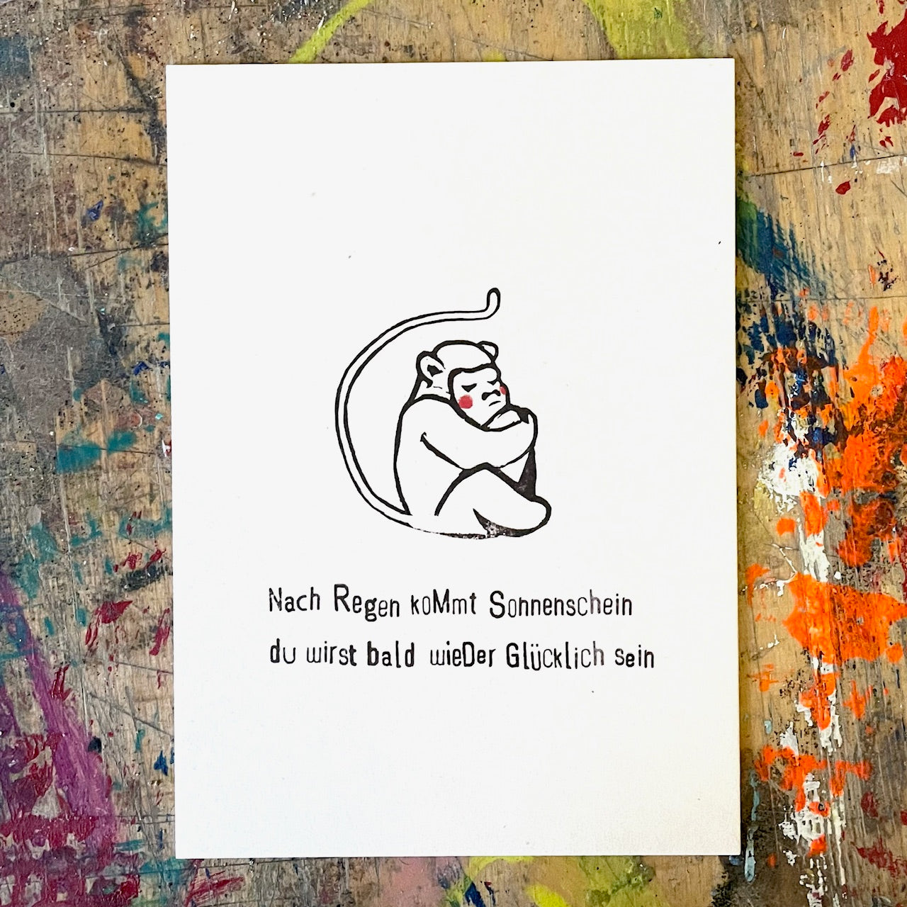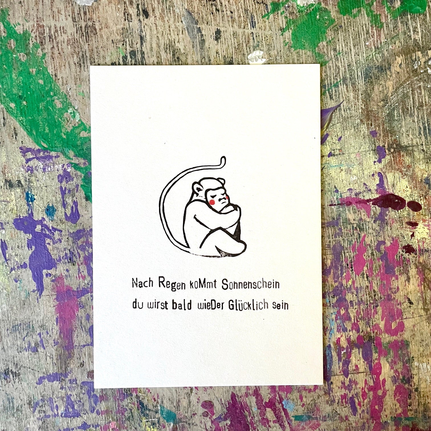 Hier kommt ein kleiner Reminder daran, dass auch schwere Zeiten vorbeigehen. Der traurige Affe auf dieser Karte zeigt, dass es okay ist, mal durchzuhängen, denn: „Nach Regen kommt Sonnenschein, du wirst bald wieder glücklich sein.“