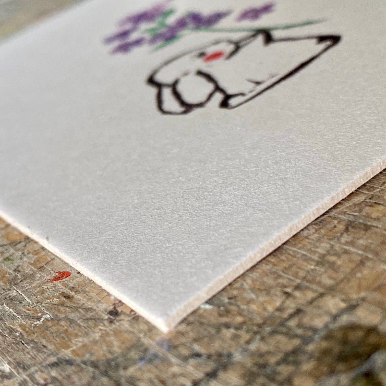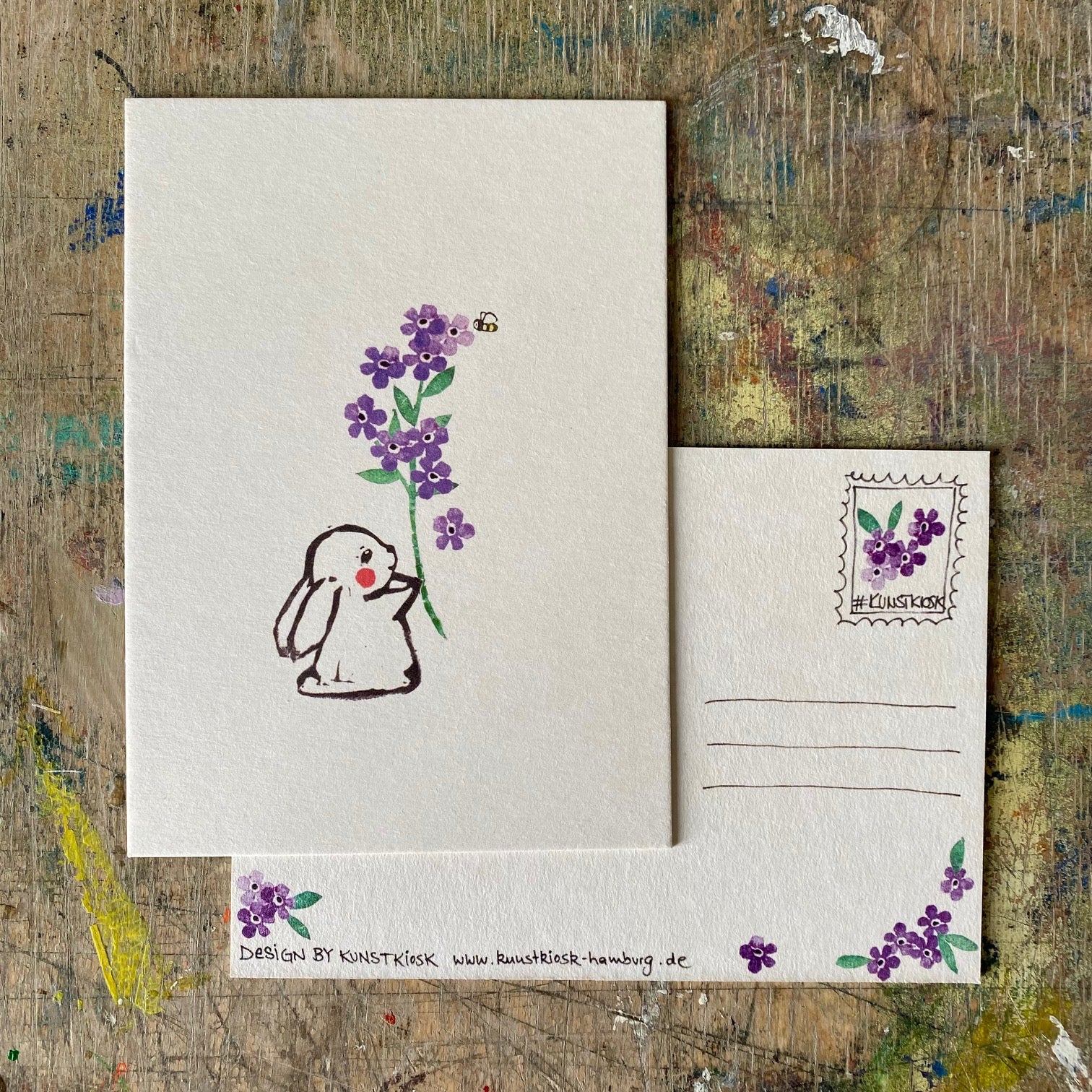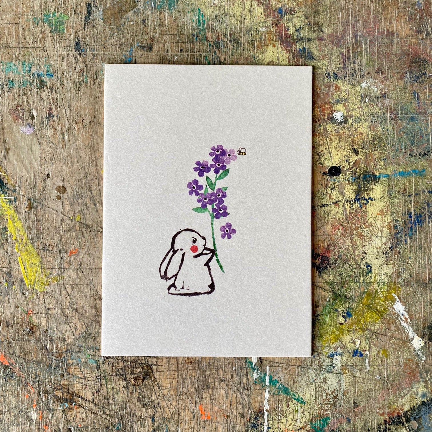 Auch als kleine Geste der Aufmerksamkeit, oder zu vielerlei besonderen Anlässen kann die Karte mit dem kleinen Vergissmeinnicht Häschen Freude bringen.