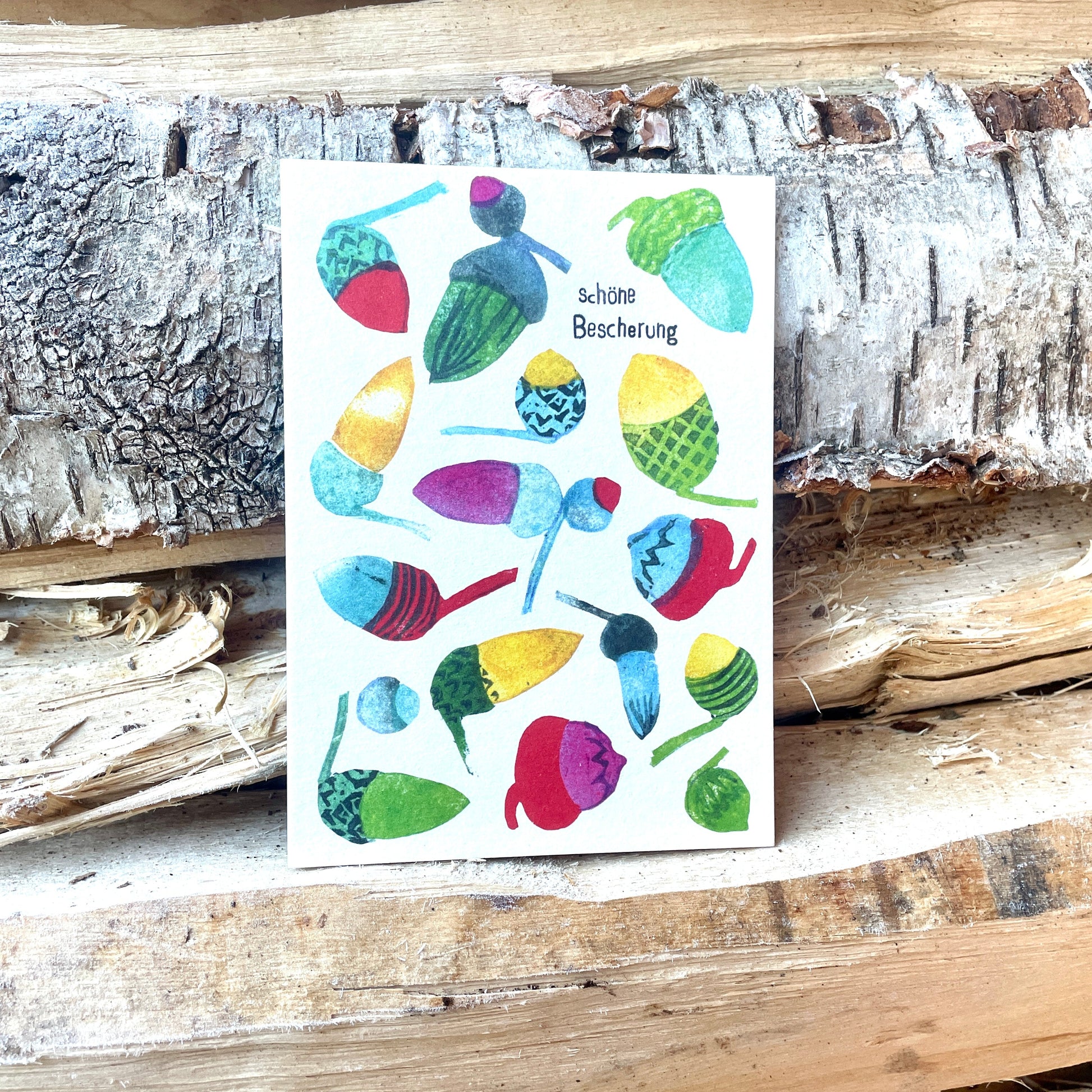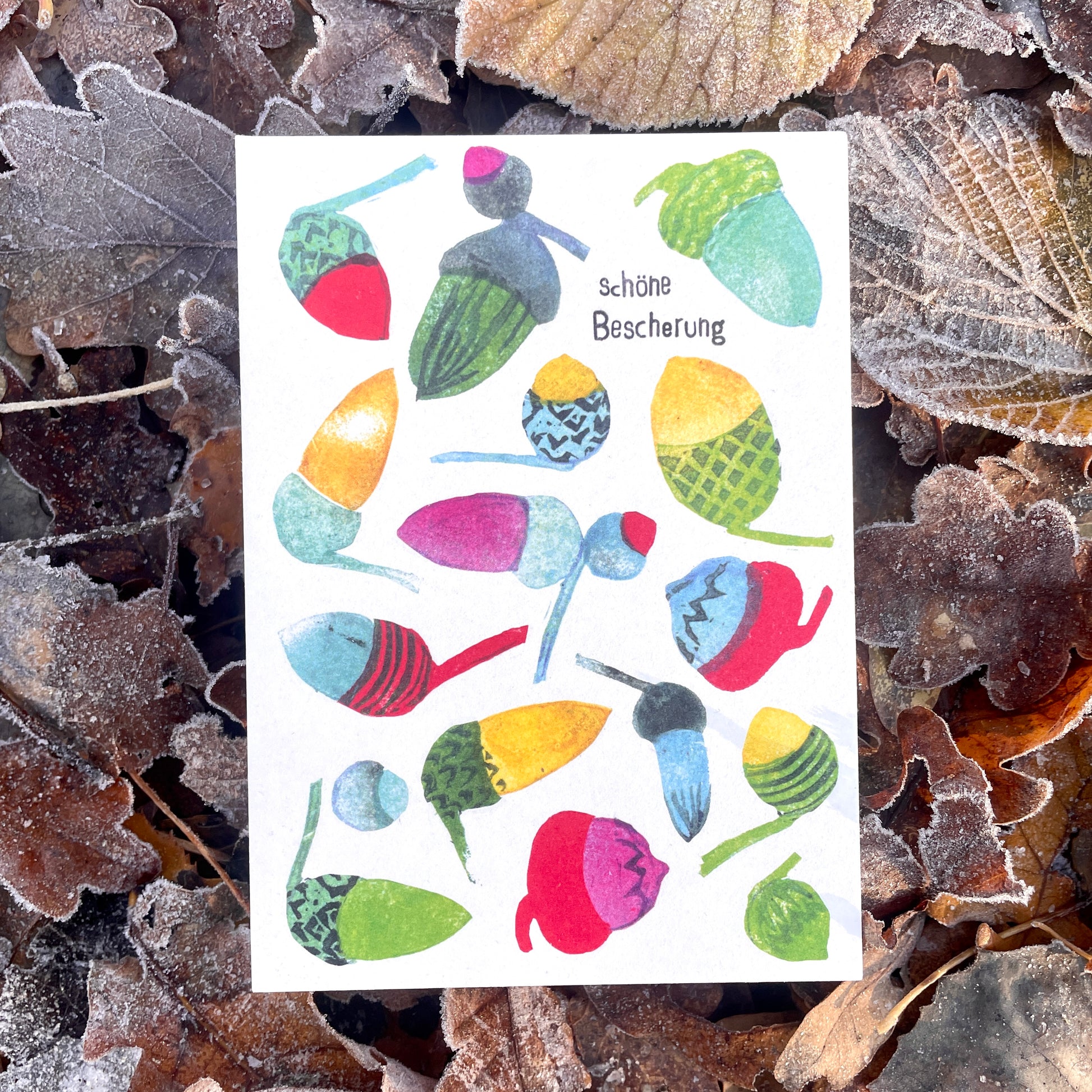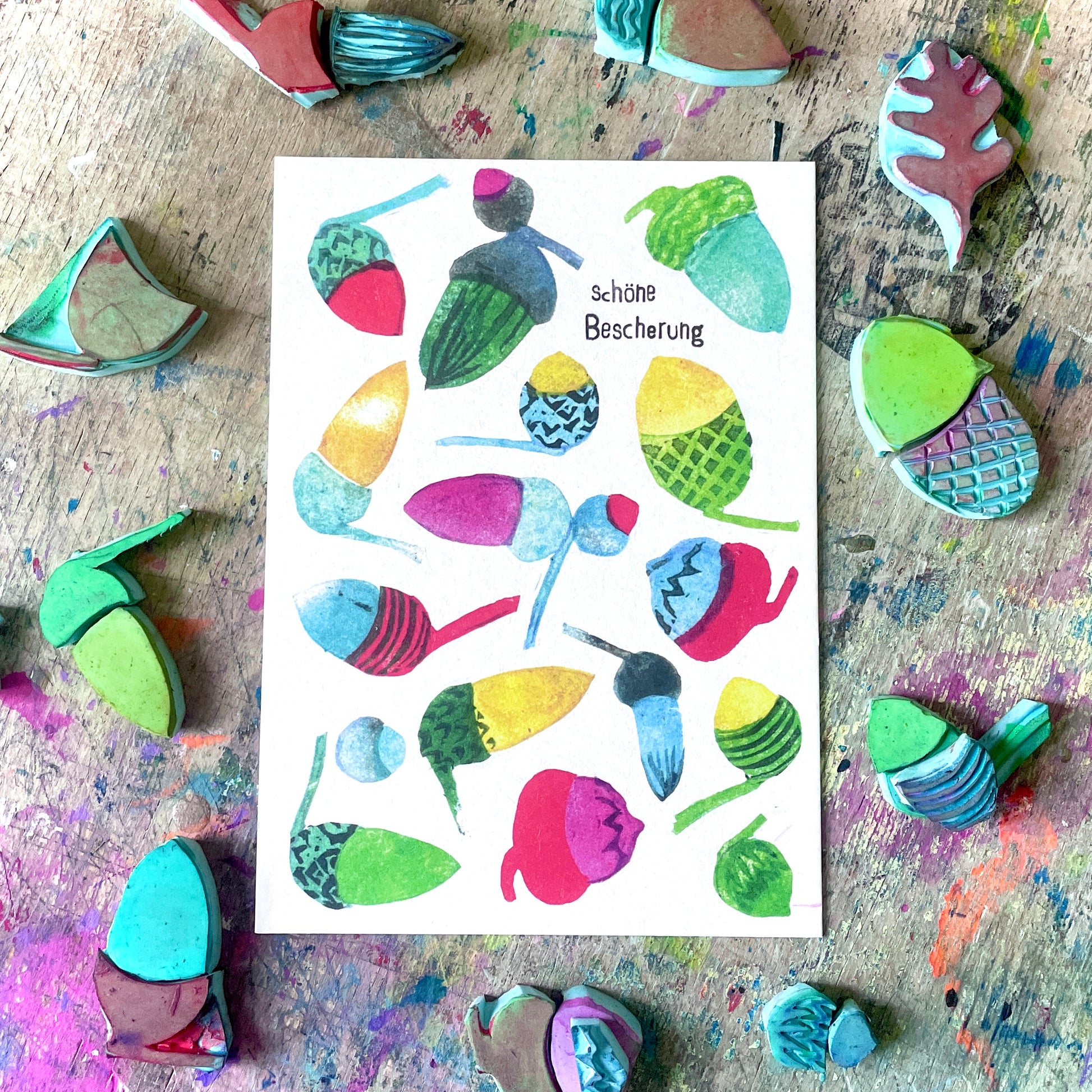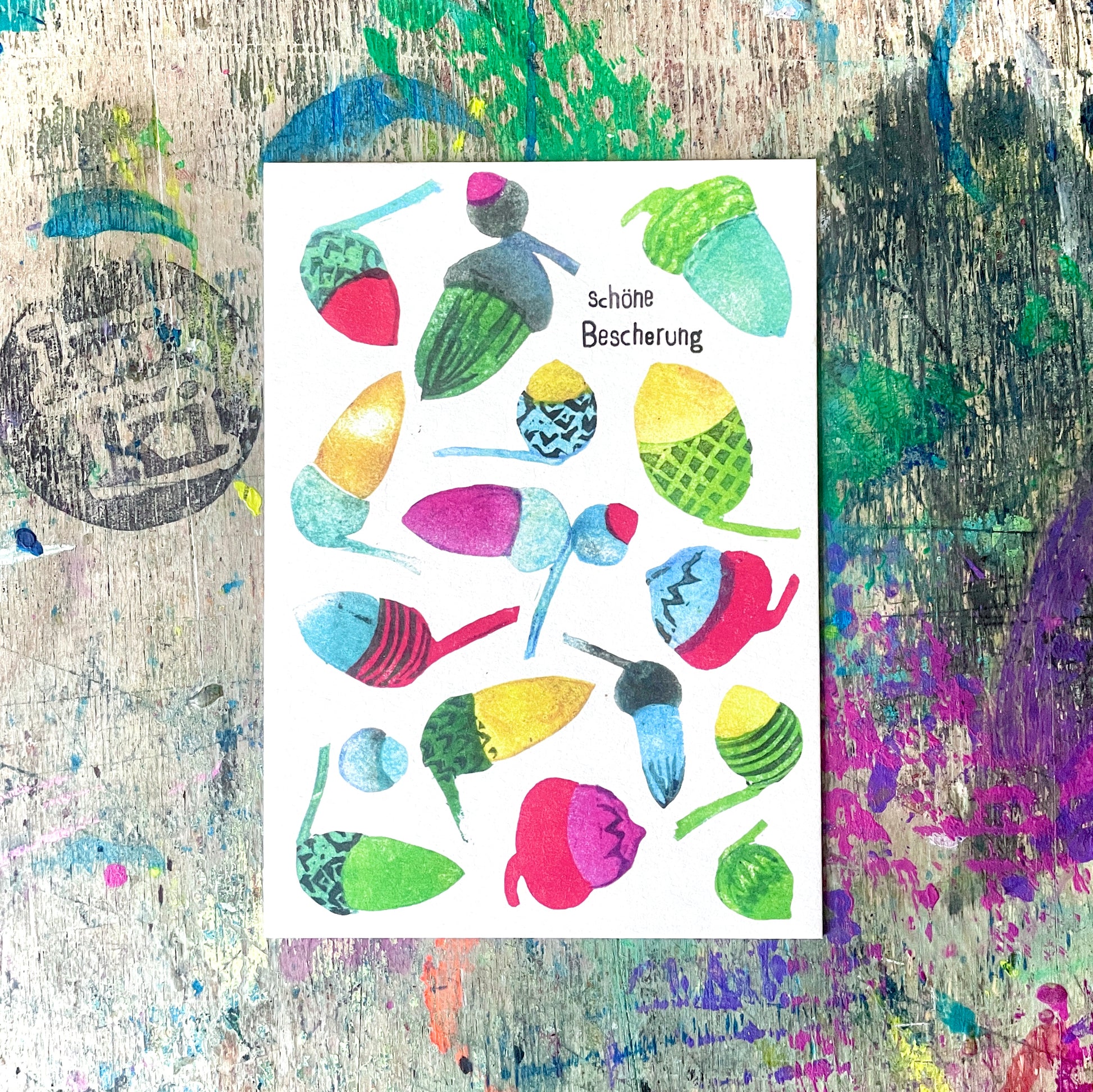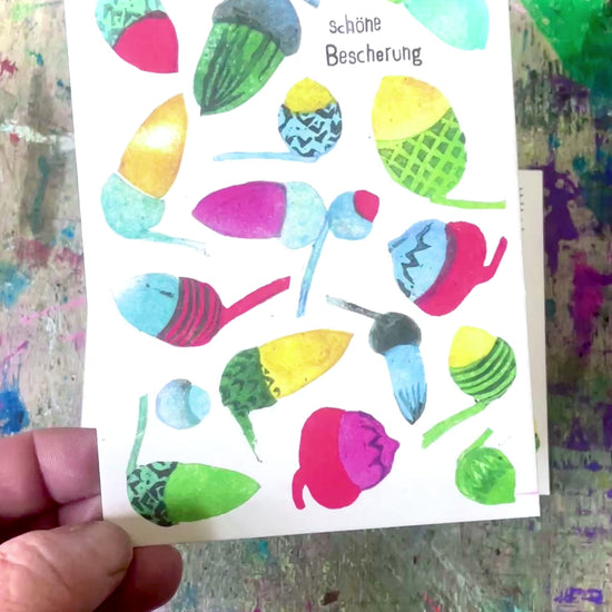 Weihnachten darf ruhig ein bisschen bunter sein. Deshalb ist diese Karte auch keine stille Nacht, sondern ein kleines Farbfeuerwerk – mit handgestempelten Eicheln in allen möglichen Mustern und Tönen.