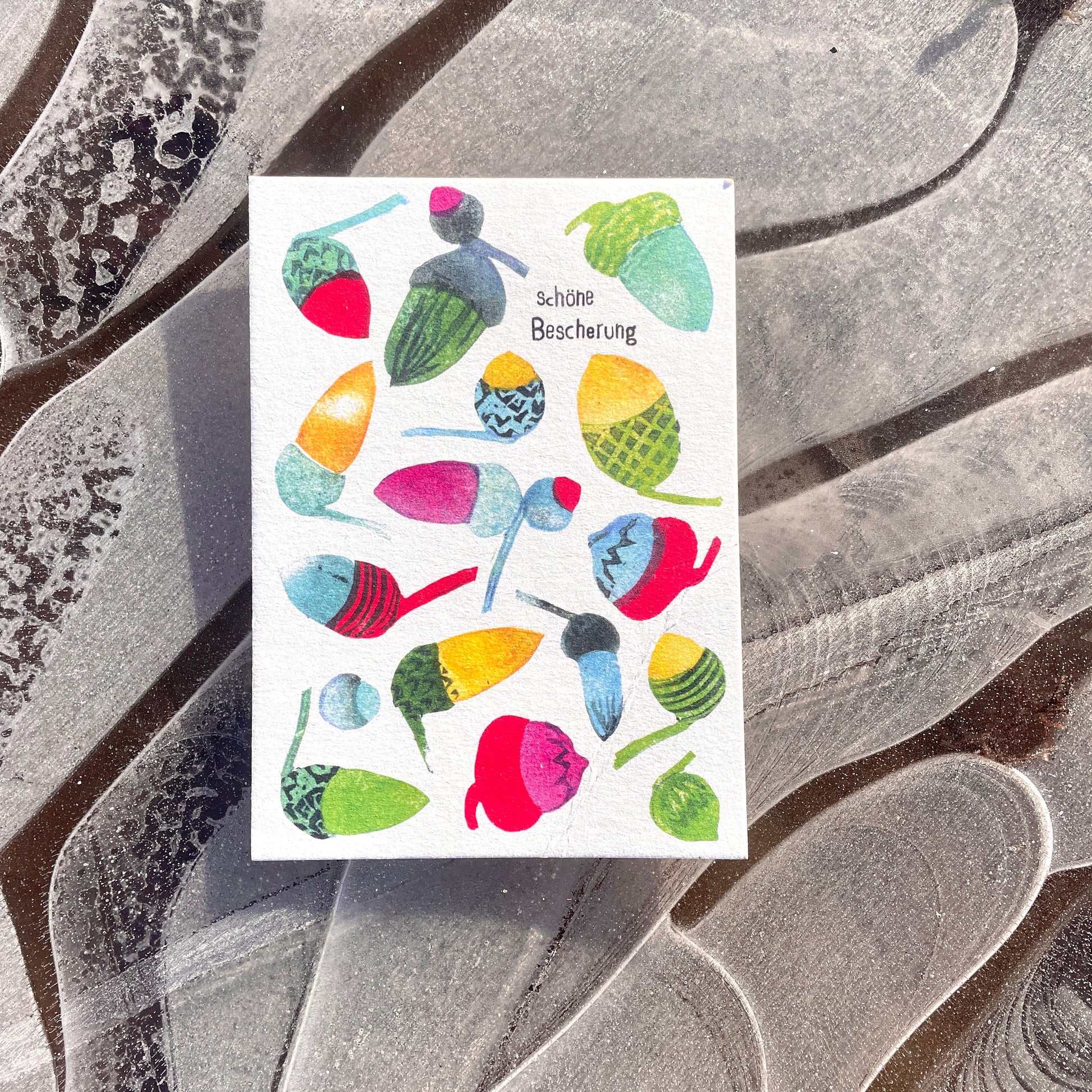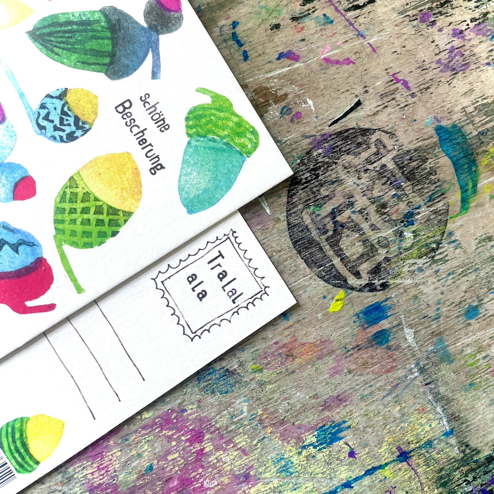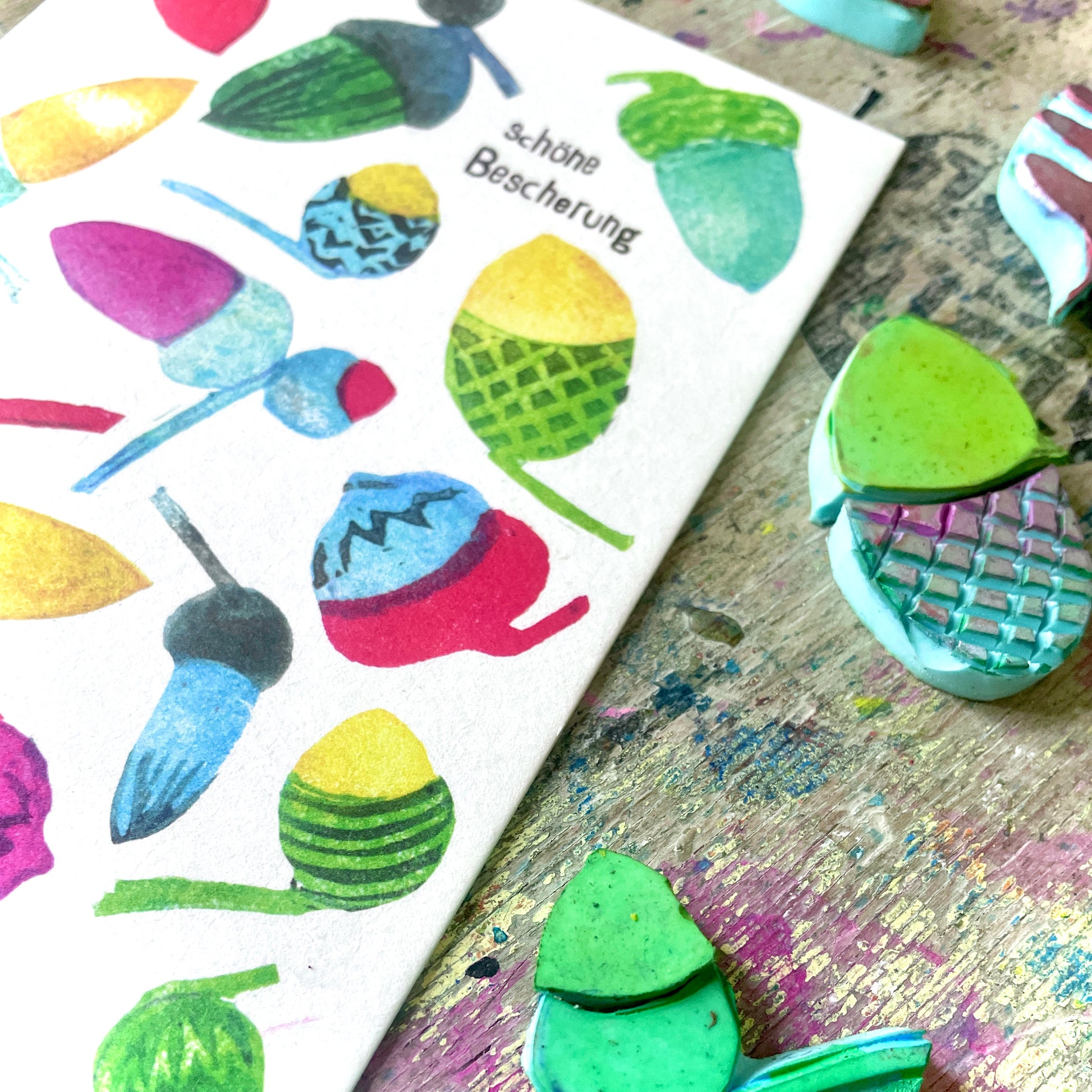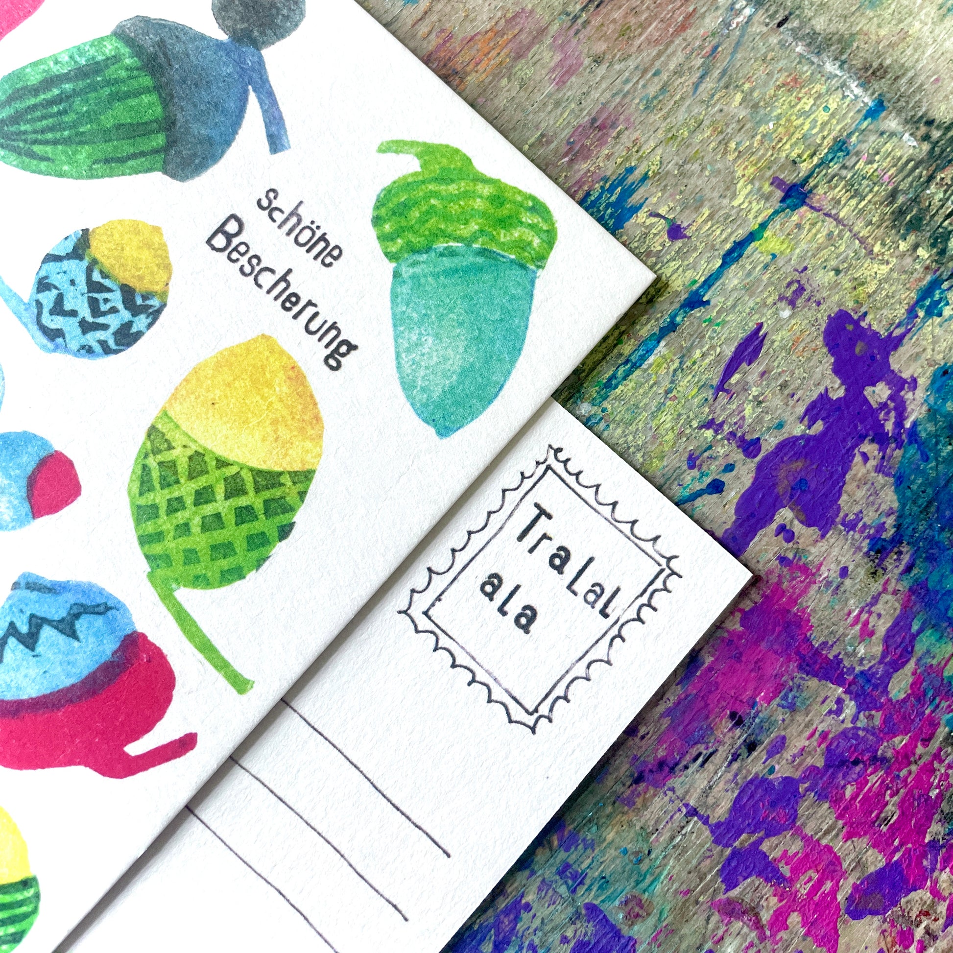 Weihnachten darf ruhig ein bisschen bunter sein. Deshalb ist diese Karte auch keine stille Nacht, sondern ein kleines Farbfeuerwerk – mit handgestempelten Eicheln in allen möglichen Mustern und Tönen.