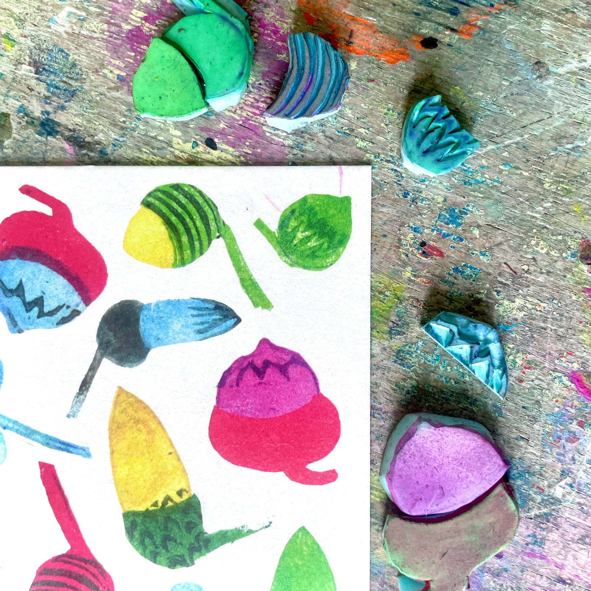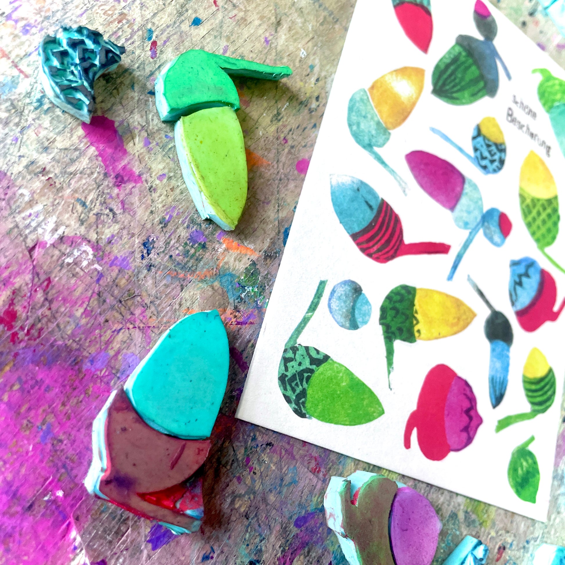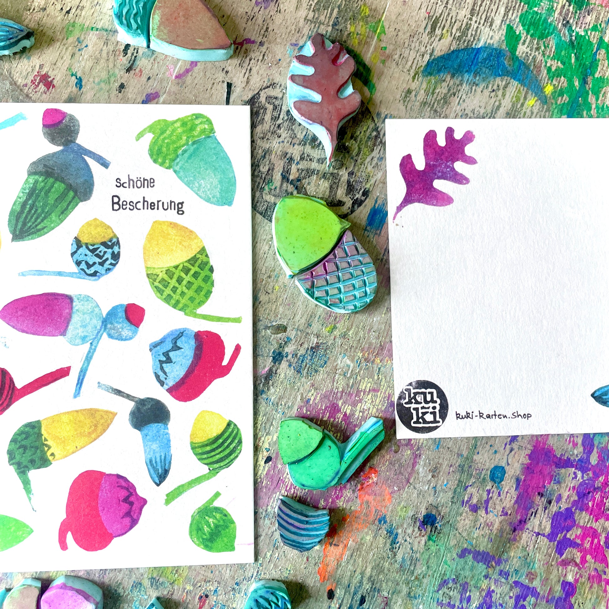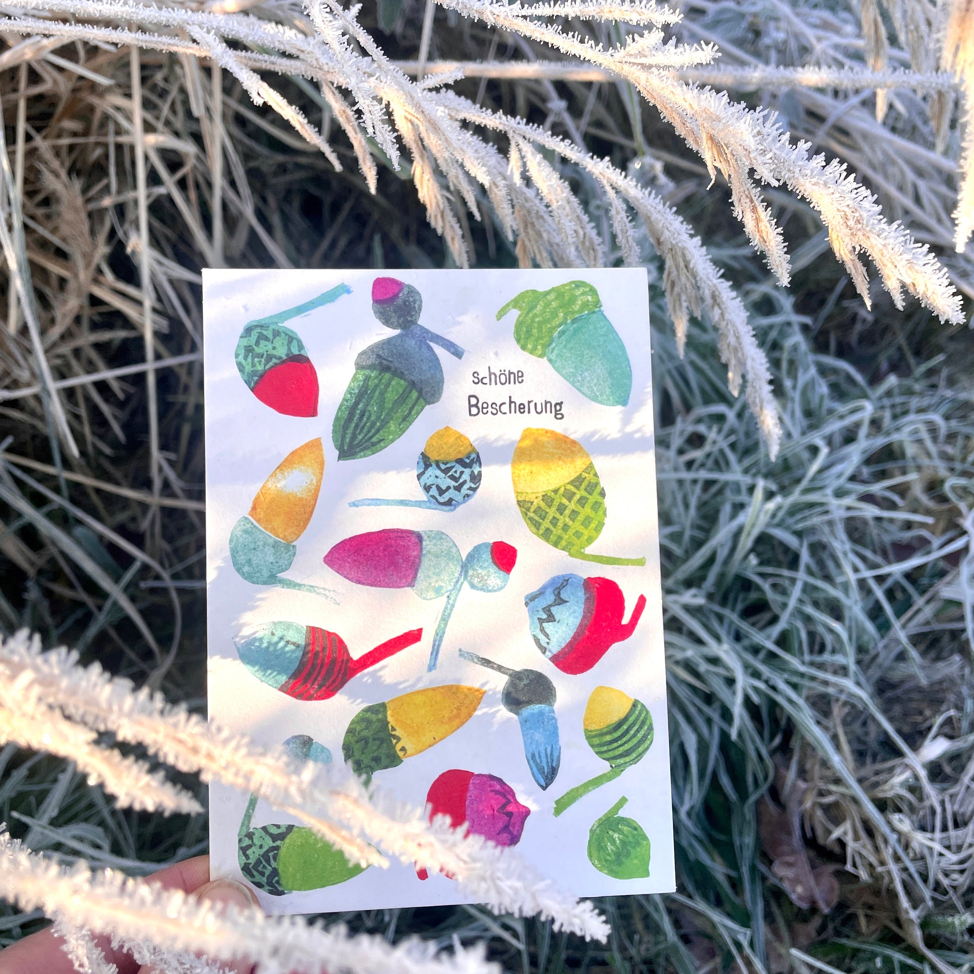 Weihnachten darf ruhig ein bisschen bunter sein. Deshalb ist diese Karte auch keine stille Nacht, sondern ein kleines Farbfeuerwerk – mit handgestempelten Eicheln in allen möglichen Mustern und Tönen.