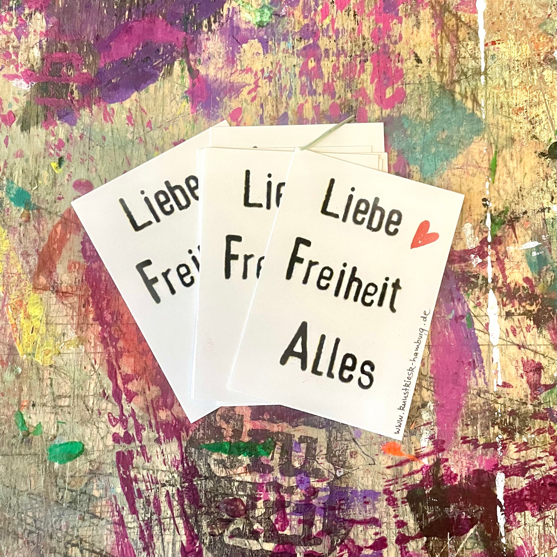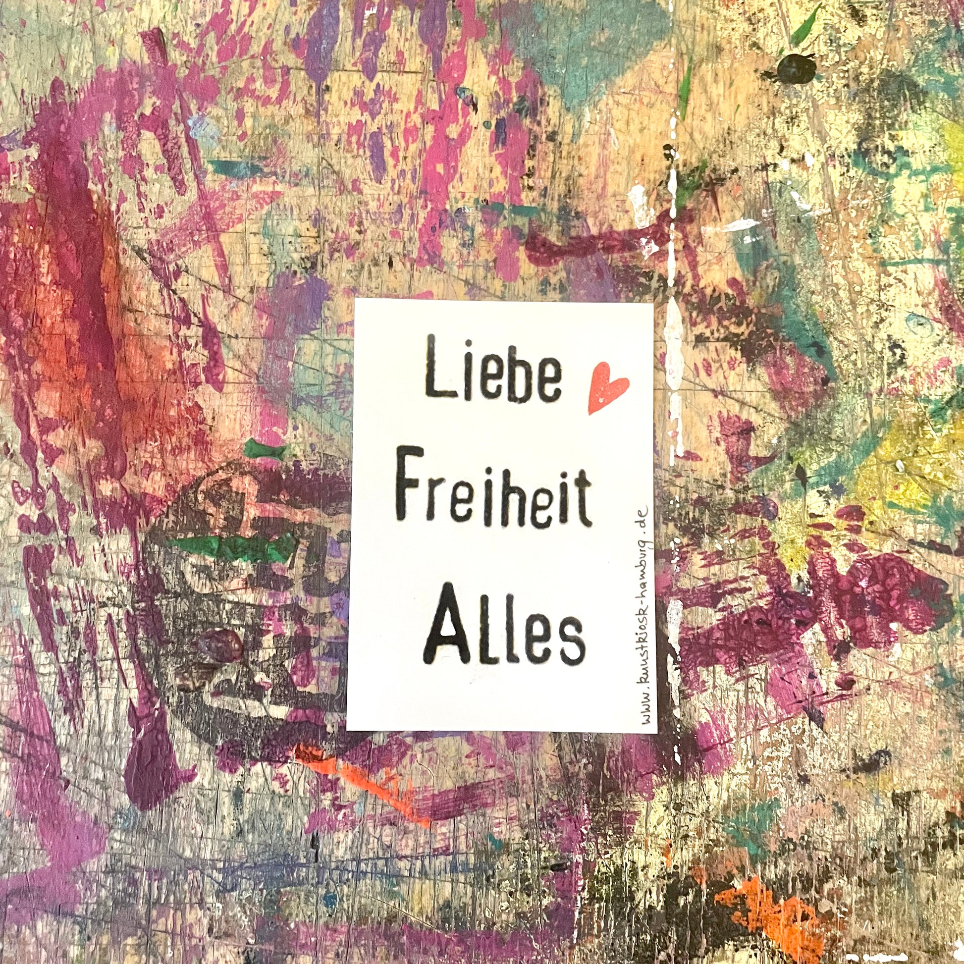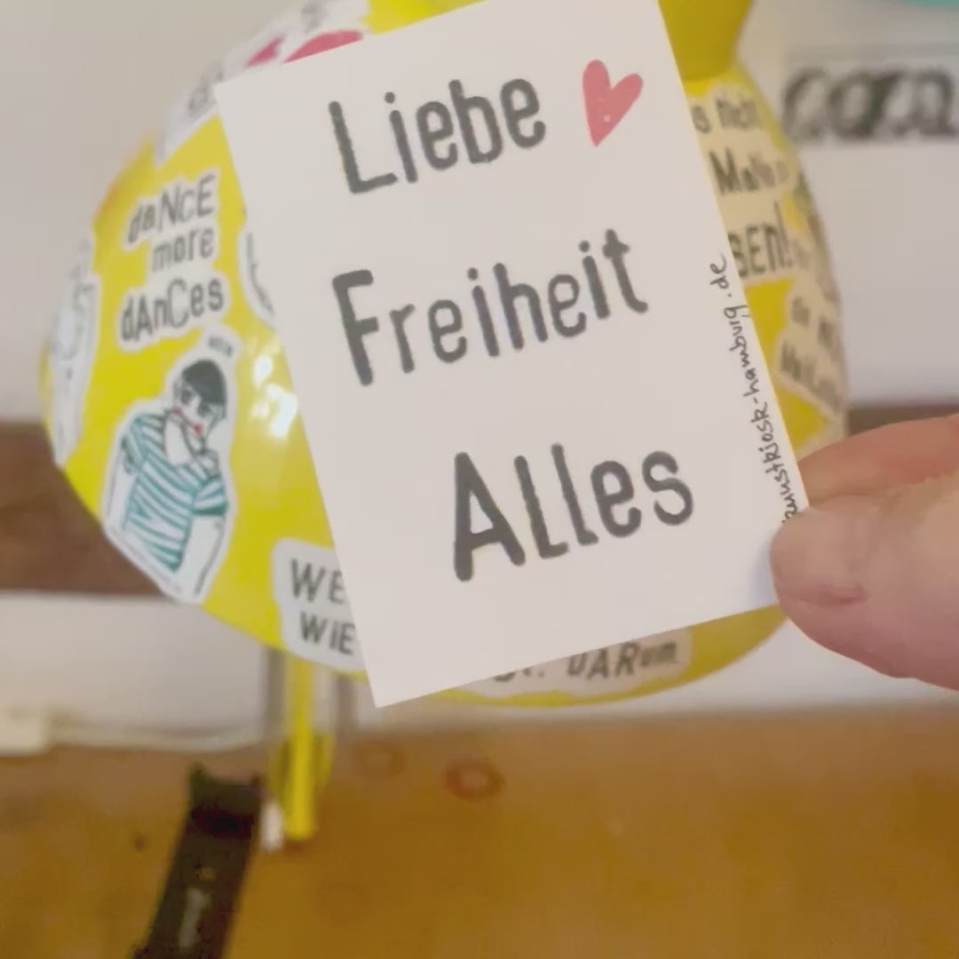 Hier findet ihr jetzt den NEUEN„Liebe, Freiheit, Alles“-Aufkleber, der mit einem Augenzwinkern und ganz viel Herz daran erinnert, worauf es wirklich ankommt. Diese kleinen, wetterfesten Sticker in 52 x 74 mm bringen handgeschnitzten Stempel-Charme direkt aus Deutschland in die Welt hinaus. Perfekt für alle, die ihren Kund:innen ein Stück liebevolle Botschaft und ein bisschen Freiheit zum Aufkleben mitgeben wollen.