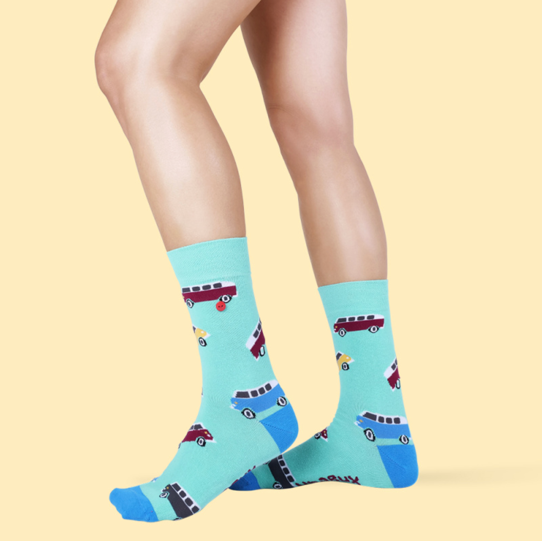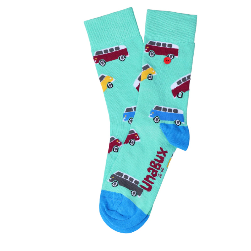 Möpmöp! Bitte fahren Sie weiter, hier gibt es nichts zu sehen. Außer ein wunderschönes Paar Socken von UnaBux. Unser UnaBux Socken Modell AUTO hält, was es verspricht. Auf türkisem Hintergrund tuckern ein paar wunderschöne classy Bullies um die Wette auf der Suche nach dem nächsten Camping-Spot.