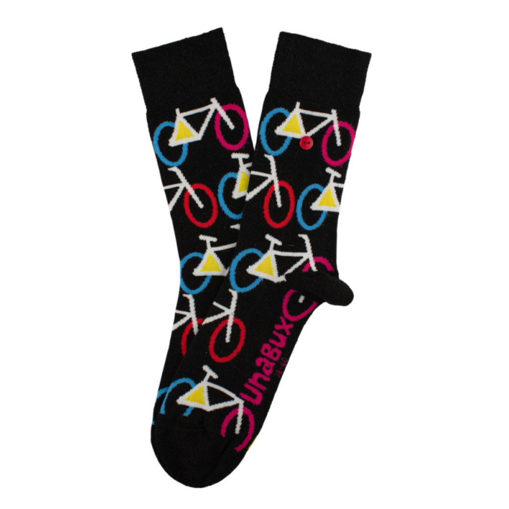 You love to ride your bicycle? Für alle, denen der Drahtesel wichtiger und lieber ist als die olle Stinkekarre. Unser UnaBux Fahrradsocken Modell CYCLE macht sich prima unter strammen Radler-Waden und auch in deinen Fahrrad-Click-Schuhen eine hervorragende Figur. Bunte Räder auf asphaltschwarzem Grund. Stark! Also: Socken an, Helm auf und ab aufs Rad!
