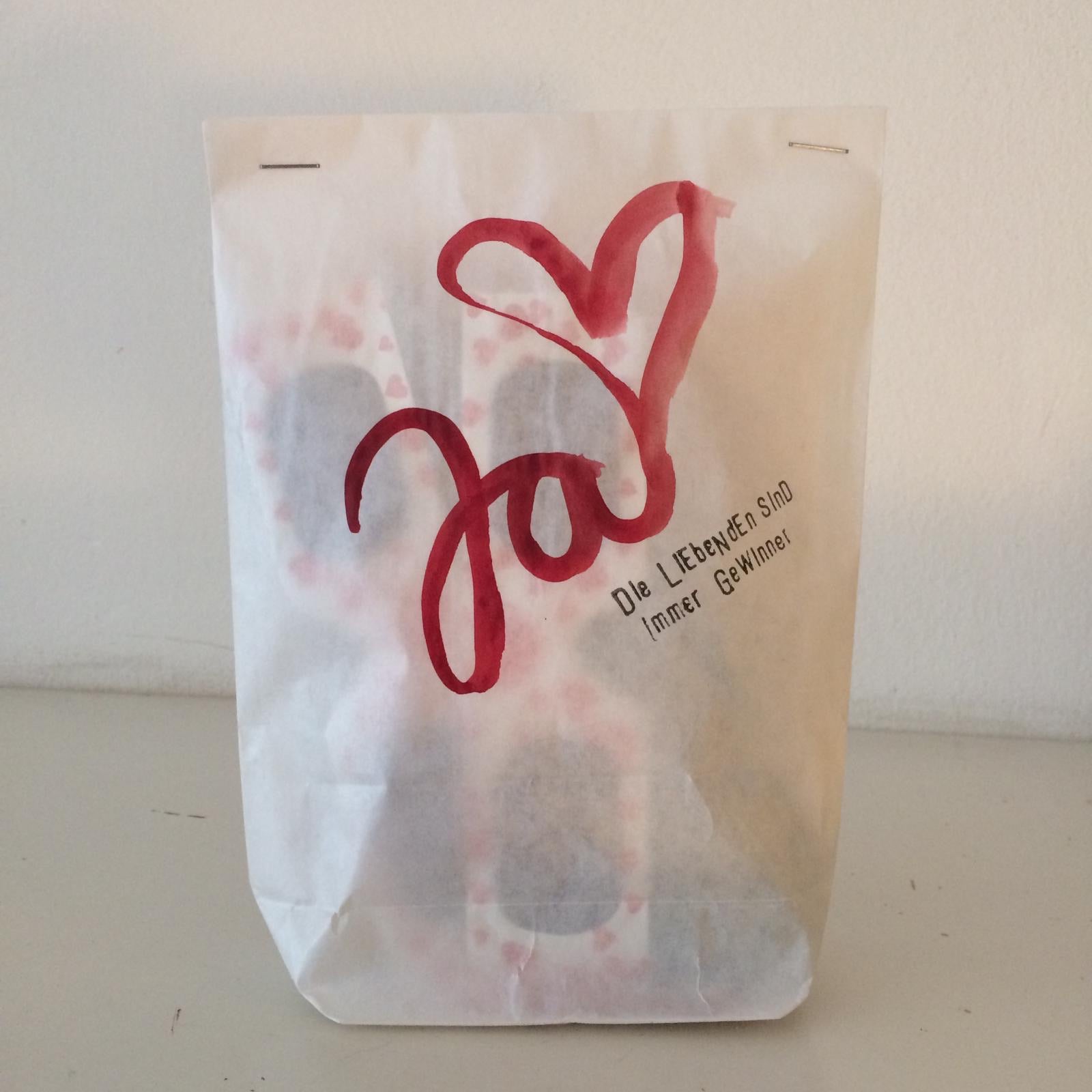 Wir bedrucken jede Tüte einzeln liebevoll per Hand. Die zusammengestellten Überraschungen variieren etwas, sind aber alle aus dem Kunst kiosk Sortiment. Mit dabei sind Buttons, Magnete Postkarten aus unserem Design, aber auch dinge anderer Künstlerinnen zum Beispiel eine kleinen handgefertigte Kerze, oder die Herzchen Zauberbrille, Konfetti und noch mehr. Alles dabei, was das Herz hüpfen läßt und ein bißchen ans Kind-Sein erinnert.
